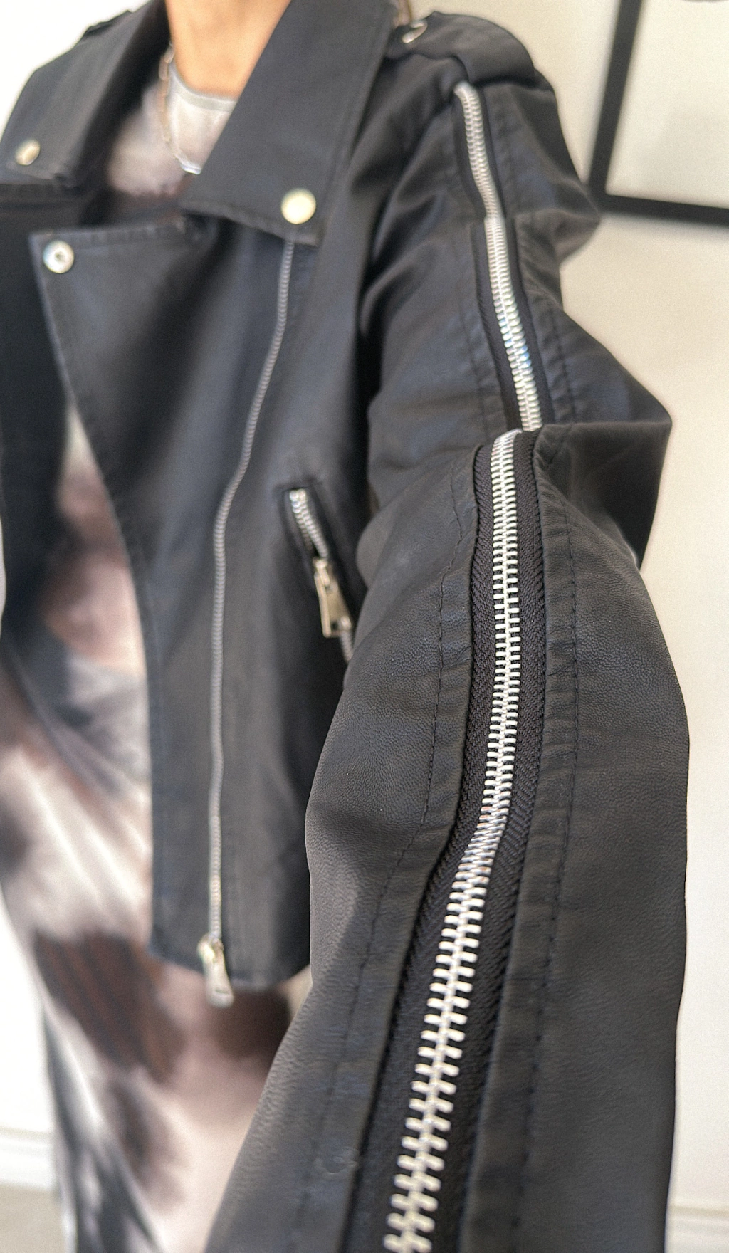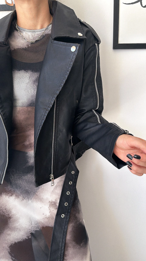 Campera eco cuero oversize con solapa y cierre real en toda la manga. Forrada. 3 talles.