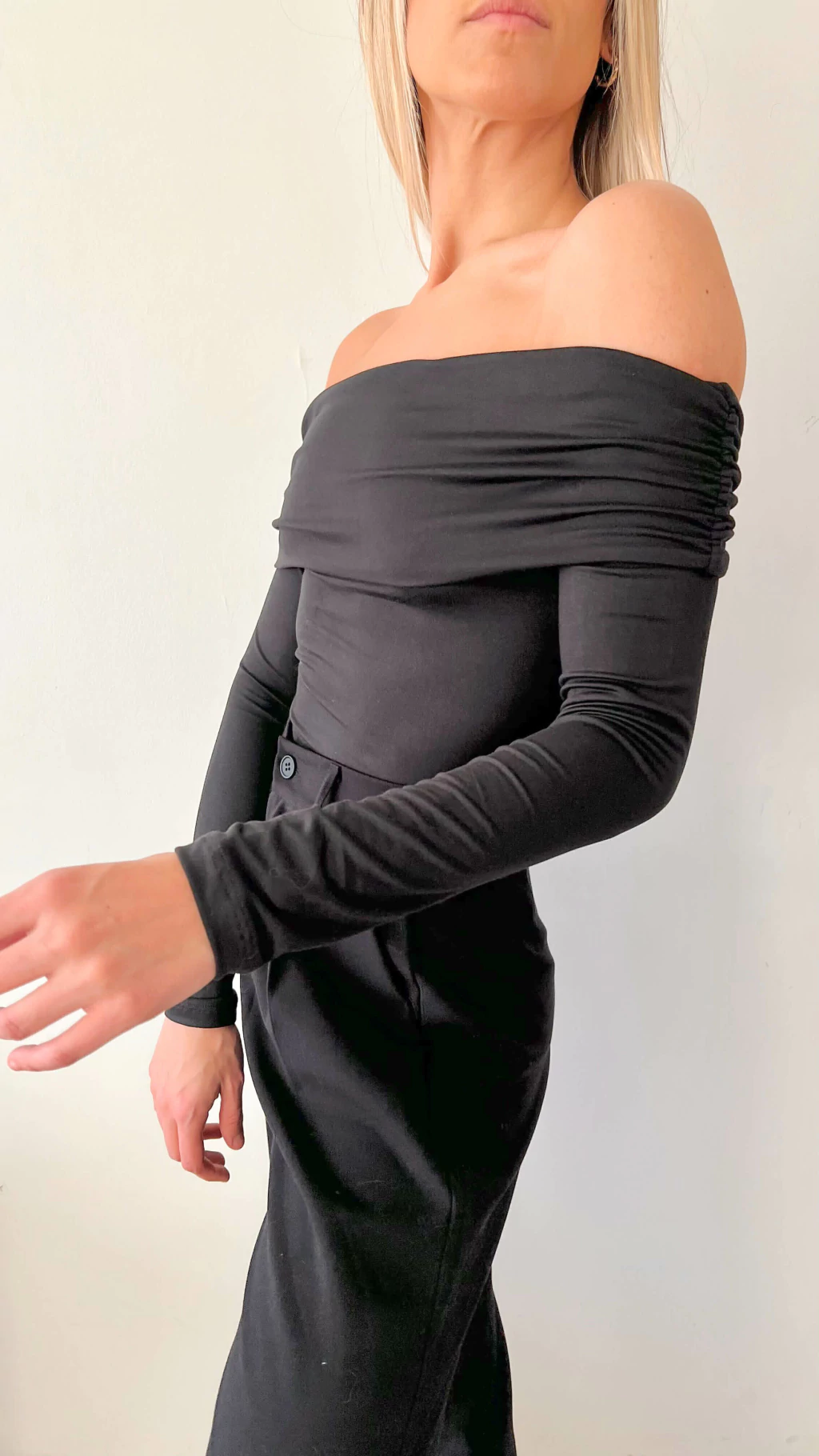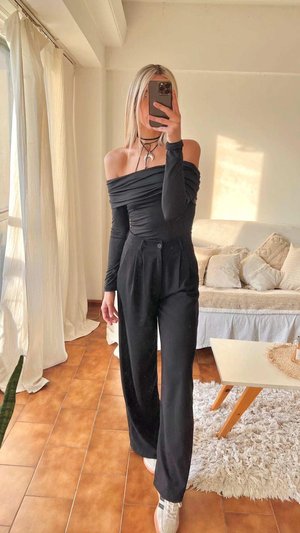 Remera negra de modal soft con cuello bote y mangas largas off shoulders. Suave, femenina y con ese toque sensual que amamos. El diseño deja los hombros al descubierto, logrando un equilibrio perfecto entre comodidad y estilo. Ideal para un look relajado con jeans o más elegante con una falda y accesorios. Combinala con pulseras y collares plateados para un toque chic extra. ¡Un must para cualquier ocasión!